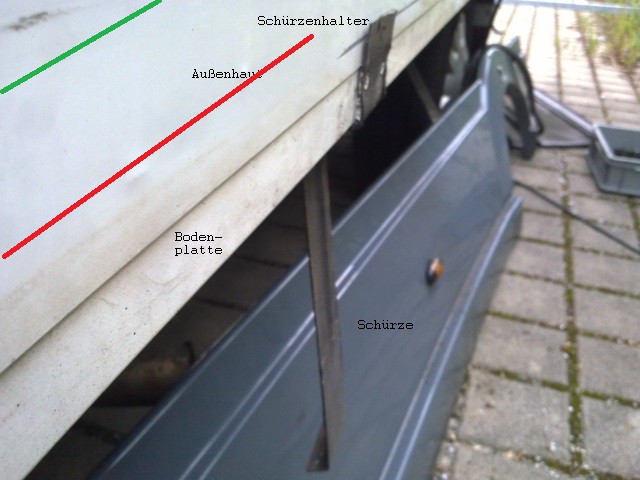 Die ganz besondere Herausforderung bei dieser Lösung sind die Halter für die Schürze. Hierzu auch noch ein Photo. Der rote Streifen würde das obere Ende des Tropfblechs darstellen. Der grüne Streifen das obere Ende der Schürze.
