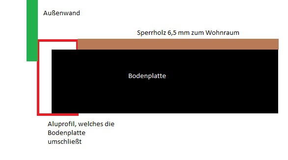 Nur um das jetzt erstmal richtig zu verstehen: Die Bodenplatte liegt in einen Aluwinkel, der um die Kante nach oben rum geht? Der Aluwinkel steht etwas höher als die Bodenplatte? Sieht auf dem ersten Photo mit dem Stechbeitel so aus. Oder ist der bündig mit dem Bodenbelag und das sieht nur so aus, weil der Bodenbelag jetzt fehlt? Die Wand steht auf der Bodenplatte und Außenhaut geht ca. 5mm über den Aluwinkel der Bodenplatte? Und dieser Bereich der Überlappung ist weder verklebt noch abgedichtet? Dann sollte es eigentlich reichen, den Bereich der Überlappung umlaufen zu verkleben.