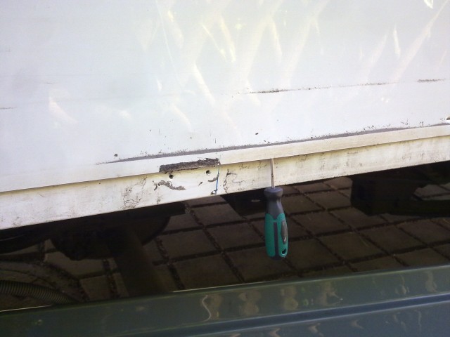 Also fing ich an der Sache auf den Grund zu gehen und entfernte den Balken nach und nach. Er war mit der Außenwand verklebt und von der Bodenplatte mit langen Schrauben versehen. Die Bodenplatte scheint zur Außenwand hin mit einem Aluprofil versehen zu sein (weiß auf den Photos) Die Außenwand selbst liegt nur an der Bodenplatte an! Keinerlei Verklebung. Der Beitel zeigt deutlich den zutage getretenen Spalt.