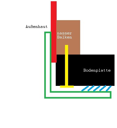 Das gelbe soll die Schrauben darstellen, die durch die Bodenplatte in den nassen Balken hinein gehen. Das grüne wäre dann der Plastikwinkel, der dann an die Seitenwand angeklebt und unter der Bodenplatte eine Lage Dichtmittel (Sika oder Dekalin?) erhält.