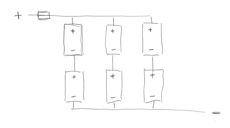 Ist entweder komisch beschrieben oder Mist !? Man könnte die Mittenabgriffe verbinden. D.h. alle Plus der unteren (bzw. Minus der oberen). Ist aber nur notwendig, wenn man erwartet, daß sich eine der Batterien in einer Serienschaltung unterschiedlich verhält. Ansonsten würde selbst bei unterschiedlicher Belastung der 3 seriellen Kreise der mittlere Punkt bei allen immer das gleiche Potential haben, da der Strom durch die Batterien gleich ist und somit auch deren Spannung, also gar kein Strom über diese Verbindung fliessen würde. RK der Sinn einer diagonale Verschaltung ist die gleichmäßige Belastung der Batterien beim Laden und Entladen würde man + und - nur von einer Seite zuführen, würde aufgrund der Widerstände der Verbindungen die vorderste Gruppe beim Laden die höchste Spannung bekommem und beim Entladen den höchsten Strom ziehen grüße klaus