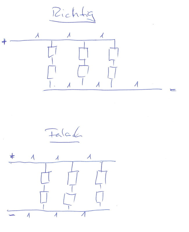 Aber ist das nicht im Schaltplan so angeordnet ? Zumindest, wenn man ihn auch als Plan der mechanischen Verbindung ansieht. Sonst zeichne es doch mal ein. RK sagen wir der Einfachkeit halber jede Verbindung hätte einen Widerstand von 1 Ohm ![]() dann sieht im oberen Bild = RICHTIG jeder Strang von + nach - 3 Ohm im unteren Bild = FALSCH sieht der linke Strang 2 , der mittlere 4 und der Rechte Strang 6 Ohm daraus resultiert die unterschiedliche Belastung der einzelnen Stränge grüße klaus Wären es Solarkollektoren oder wären es Heizkörper, wäre das Modell "Richtig" ein Anschluss nach Tichelmann. Ich habe mir die bombastische speicherbare Energiemenge von ca. 8 kWh ausgerechnet, in ca. 400 kg Akkumulatoren. Eine 11 kg Gasflasche enthält 140 kWh, aber eben nur Wärme, keinen Strom. Ist das Pferd nun tot oder nicht? :D ????? Gr.R |