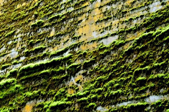 Bizarre Formen entwickeln sich über Beton und herausragenden Stahlteilen.
