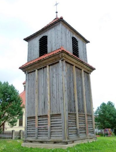 Der Glockenrurm aus Holz steht neben der Kirche.