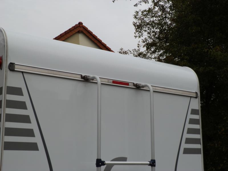 Jetzt ist mir beim Rückwärtsfahren im Dunkeln ein Malheur passiert. Ergebnis waren drei größere Dellen hinten mittig in der Dachrundung. Und das Schlimmste: in der unteren Delle hat die Aludachhaut ein Loch. Ich habe dies natürlich sofort mit Panzerband abgeklebt um ein Eindringen von Wasser zu verhindern.