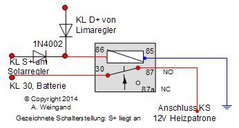 So ist es :ja: Allerdings ist diese Installation für den Solarbetrieb (mehrere Std./Tag) nicht zu empfehlen....zumindest, wenn die Patrone ~170 W hat. Allein durch die EBL Verschaltung blieben ~2 V irgendwo auf der Strecke, die Kontakte bzw. Relais sind dem einfach nicht gewachsen. Daher kommt auch immer wieder der Einwand, das der 12 V Betrieb beim Kühli nicht zufriedenstellend funktioniert. Also bei mir im Carado 344 geht der Kühli auf 12V während der Fahrt gut, selbst Speise-Eis bleibt im Eisfach hart. Wenn der Kühlschrank erst mal seine Temperatur erreicht hat, sollten die 120W / 12V reichen um die Temperatur über den Tag zu halen, nachts läuft er dann auf Gas. Wenn man ihn neu bestückt und erst mal herunterkühlen muss ist es sicher besser ihn auf Gas oder auf 220V zu betreiben, um schnell die Temperatur zu erreichen. Man kann auch ein Leistungsrelais / Umschalter verbauen, so dass es in Ruhestellung die Bordbatterie zum Kühlschrank durchschaltet und mit D+ anzieht und auf die LiMa wechselt. 10A sind aber jetzt nicht soo viel Strom, dafür sollten die kleinen Relais mit 30A Nennstrom reichen. Der RML 8555 hat je einen Eingang für D+ und S+. Da wird Dometic vorgsorgt haben, dass sich die Signale nicht in die Quere kommen und man auf Dioden verzichten kann. Ich denke die AES - Kühlschränke haben genug 'Eigenintelligenz', da muss man nicht noch irgendwelche Verriegelungen davorschalten, die einem bloß die Versorgungsspannung nach unten drücken. Die EBL's sollte man bei solchen Geräten eher außen vor lassen und den Kühlschrank mit einem möglichst kurzen und dicken Kabel an die Aufbaubatterie anschliessen (vielleicht mit einem eigenen Hauptschalter). Es muss nur sichergestellt sein, dass das Trennrelais zwischen Aufbau- und Starterbatterie bei Anliegen vom D+Signal auch wirklich immer schließt. Nicht zu vergessen ist die Versorgungsspannung für die Elektronik des Kühlschranks, damit er sich entscheiden kann auf welche Energieversorgung er zurückgreift. krischan So könnte die Schaltung selbst aussehen: ![]() Die beiden Dioden entkoppeln die beiden Steuersignale S+ und D+ gegeneinander. Das Ganze dann im EBL umbauen, fetisch. Viel Erfolg, Andreas Der Betrieb mit Wechselrichter ist in diesem Sommer in Norwegen an manchen Tagen bis zu 8 Stunden durchgehend gelaufen. Dazu reichten 240 Wp aus. Ich hatte, wenn wir unterwegs waren, sogar die AES Steuerung abgeschaltet und den WR auf Dauerbetrieb. Im Sommer geht bei schönem Wetter alles. Auch während der Fahrt läuft bei mir der Kühlschrank auf 230 V. Er bleibt auch eingeschaltet, wenn wir zum Einkaufen gehen. Mit 80 Ah Batterie in Norwegen kein Problem. Besonders wenn der Wetterbericht für Narvik 24 Stunden/Tag Sonnenschein verspricht. |