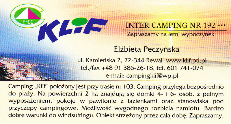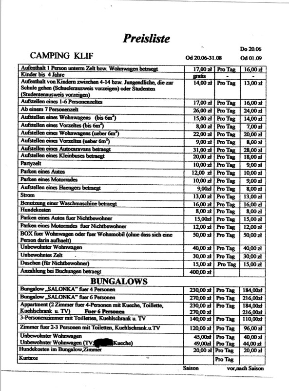 Ein weiterer Campingplatz in Rewal, und wie wir empfinden, der schönste. Er liegt am westlichen Ortsrand, direkt hinter dem Dünenwald und besteht aus zwei Teilen: einem parzellierten Teil links und einer Wiese, auf der man seinen Platz selbst aussuchen kann. Durch die nahe vorbeiführende Straße ist der linke Platzteil wohl zeitweise etwas laut. Natürlich ist er in der Hauptsaison auch ziemlich voll. Der Sanitärbereich ist sauber und gepflegt. Einkaufsmöglichkeiten (Supermarkt/Discounter) sind in der Nähe, ins Ortszentrum sind es wenige Gehminuten. Auch das Lokal wirkt einladend, Essen ist gut und preiswert. Das Meer liegt direkt hinter dem Platz unter einer Steilküste, man muss eine Treppe hinab, um zum weiten Strand zu kommen. Am Klippenrand führt ein Weg entlang, auf dem man zum nahegelegenen Trzesacz kommen kann: ![]() In Trzesacz gibt es die Reste einer Kirche, die so nach und nach - durch die Arbeit des Meeres an der Steilküste - ins Meer gestürzt ist: ![]() Und abends gab es über dem Meer einen atemberaubenden Sonnenuntergang: ![]() Wir waren letzte Woche da, ich kann mich dem oben geschriebenen nur anschließen. --> Link Als kleinen Zusatz noch die Visitenkarte und die Preisliste für 2014: ![]() Fahren schon seit 6 Jahren den Platz immer wieder an. Campingplatz und die Stadt sind zu empfehlen. Nehmen auch die ACSI-Karte. Wir haben hier Anfang Juli 2015 eine Woche verbracht. Ich kann mich den Vorschreibern nur anschließen: ein toller Platz in einem netten Ort Hier standen wir im Juni 2013 und können den Platz ebenfalls empfehlen. Die Ausstattung ist einfach, aber sauber und alles ist gepflegt. Die Betreiber sind SEHR freundlich und man kommt sprachlich gut weiter. Das Platzrestaurant bietet kleine, einfache Speisen zu günstigem Kurs. Der Ort läd ebenfalls mit vielen gemütlichen Kneipen und Restaurants zum verweilen ein. Zum Strand muss man die Steilküste runter. Das war aber auch für mich als Bewegungsmuffel noch gut machbar. ![]() ![]() Wir klapperten die Küste mit dem PKW/Pickup von Swinemünde bis zur Danziger Bucht ab und der Platz in Reval war letztlich der einzige wo wir stehen wollten. Viele Plätze haben wir auf unserer Suche gesehen, sogar welche mit angenehmer Lage, aber die Pflege und Ausstattung ließ SEHR zu wünschen übrig. Weiterhin waren viele Orte die Küste entlang eine einzige Baustelle. Es wird was getan, blos blöd für und wenn die was tun und wir uns erholen wollen. Wir werden noch paar Jahre warten, bevor wir den nächsten Polenurlaub als Camper in betracht ziehen. Tipp: Es gibt tausende kleine, neue Ferienhäuser dort. Eines schöner als das andere und beim EInkaufen wird mit 50.--€ das Wägelchen noch fast voll. |