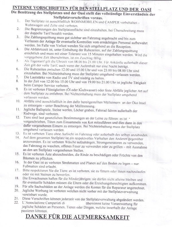 In Deutschland... naja, hätte ich geglaubt, dass es irgendwo so etwas gibt, aber in Italien? Fundstück der Woche! :D ![]() Na, wer weiß, wo es ist? Endlich ist es irgendwo mal verboten, mit Steinen nach den Tieren zu werfen . Gardasee! Aber die Punkte 2. , 7. , 9. und 14. halte ich für tragbar und sollten selbstverständlich sein. Ausnahme zu 2., der SP hat überhaupt keine markierten Stellflächen. Warum sollte man das tun, es haben doch praktisch alle Mobile einen Abwassertank. Habe dieses merkwürdige verhalten noch nie begriffen, es sei denn die Köche sitzen auf ihren Treckingrucksack vor einem Kartuschenkocher. Dann halte ich 17. auch für tragbar, und das ist nicht ironisch gemeint. Die ist doch perfekt. Sie wäre perfekt und im Grunde überflüssig weil selbstverständlich wenn nicht all zu viele Zeitgenossen Freiheit mit Ignoranz verwechseln würden. An anderer Stelle in diesem Forum wurde sinngemäß geschrieben: "die eigene Freiheit endet an der Stelle wo die eines Anderen anfängt" Unter weitgehender Einhaltung dieses Grundsatzes wären Platzordnungen ohnehin überflüssig. Ich tippe auf Monzambano , Hellasfan Union Lido? :D Hm, eigentlich ist es ja traurig, dass es sowas in dieser Ausführlichkeit gibt. Egal in welchem Land. Aaaaber es gibt nun mal diese A....geigen, die dieses oder jenes Recht für sich in Anspruch nehmen, ohne Rücksicht auf ihre Mitmenschen. Ich finde die Platzordnung ganz ok. Wem sie nicht gefällt, kann sich ja einen anderen Platz suchen und sich dann ärgern. :-D Eisbaerchen :dance2: :dance2: :dance2: Helmut