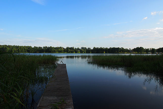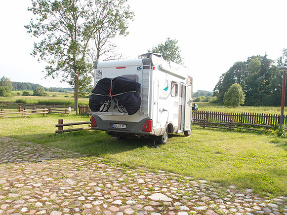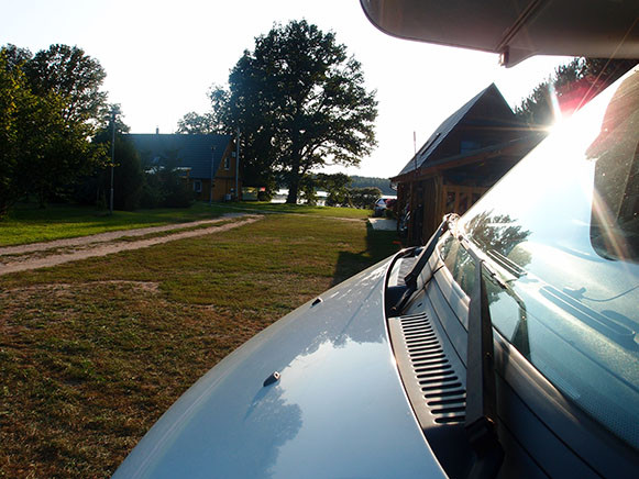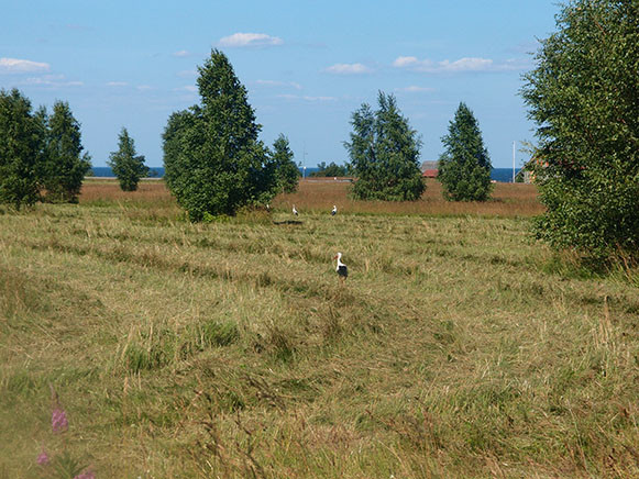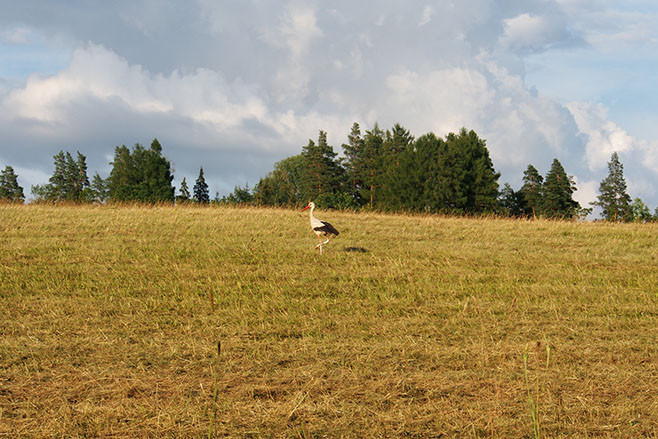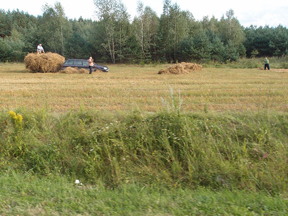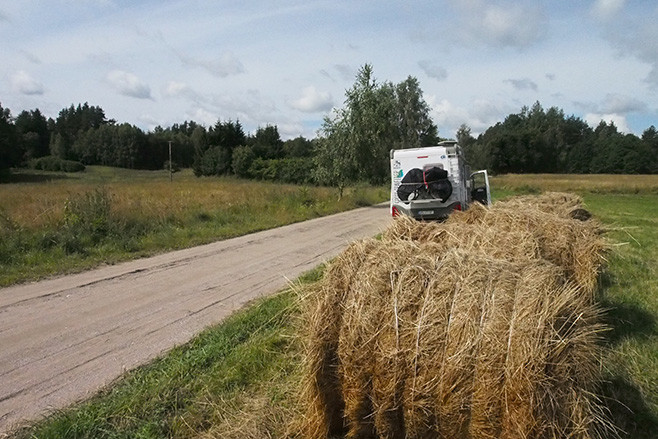 Kurz hinter Mragowo befinden wir uns jetzt schon mitten in Masuren in einem klitzekleinen Dorf mitten in der Pampa. Neben unserem heutigen Übernachtungsplatz war vorhin ein Storch... überhaupt haben wir auf der bisherigen Reise schon soviele Störche gesehen, wie in unserem ganzen bisherigen Leben nicht soviele auf einmal. Später kam noch kurz ein junger Mann vorbei und er kam ganz dicht an 'Trevor', was wir doch etwas merkwürdig fanden. Felix ging raus und sprach ihn an und es stellte sich raus, dass er nur die Heuballen neben uns kontrollieren wollte. Halbwegs beruhigt, aber sicherheitshalber mit Alarmanlage hatten wir eine vollkommen ruhige Nacht!