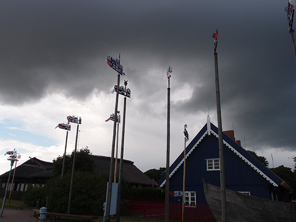 Pünktlich zur Abfahrt, nachdem wir Abwasser abgelassen, Frischwasser zu uns genommen hatten und alles verpackt war, fing es nach zwei sonnenreichen Tagen wieder an zu regnen. Bis zur Fähre regnete es noch ziemlich heftig. Deshalb fiel unser Abstecher in Juodkrante (früher 'Schwarzort') auch recht kurz aus. Wir sahen den Fischerhafen und konnten ein paar Skulpturen vor dem Hafen bewundern, das war's auch schon. Den Rest beschauten wir von Trevor aus im Vorbeifahren. Den Bernsteinhafen - damals extra für den legendären Fund gebauter Hafen (ca. 2250 t Bernsteinschmuck und unbearbeitete Steine wurden im 19. Jhdrt vor Juodkrante durch Zufall beim Fahrrinne ausbaggern gefunden und zutage gefördert) - haben wir nicht mehr angeschaut, wäre wohl auch nicht mehr allzu viel zu sehen gewesen. Insgesamt ist Juodkrante ein kleiner netter Ort, sehr touristisch rausgeputzt - viele Schilder sogar in Deutsch...