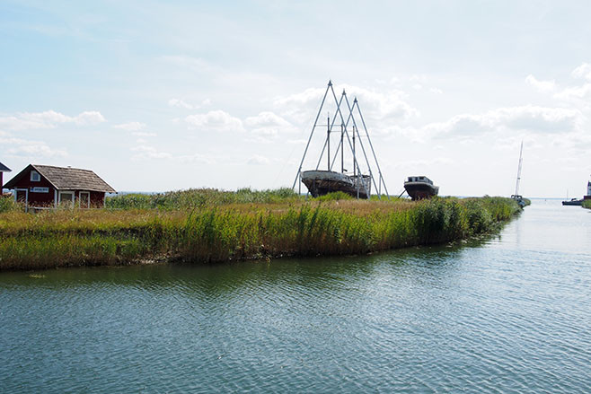 Nachdem wir gespiesen und geruht haben, geht es zum ersten Mal mit den Fahrrädern los - nach Nida. Wir sehen uns Kurenwimpel, Kurenkähne, Fischerhäuschen und den Hafen an.