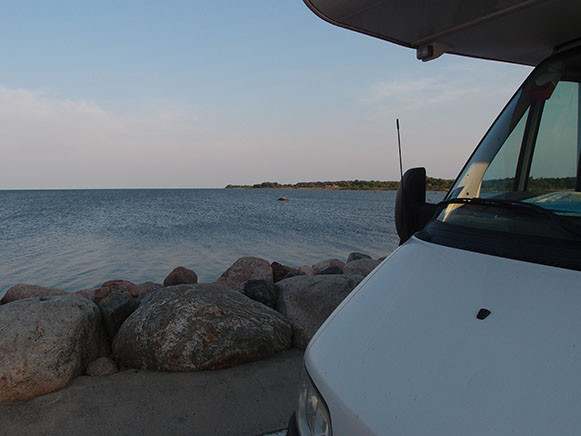 In dieser fantastischen Kulisse unseres Übernachtungsplatzes in Vente sind wir recht früh aber völlig ausgeruht aufgewacht und schauten bereits vom Bett auf's Haff... die Sonne schien!