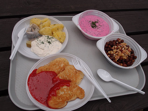 Wir haben heute einen Salat mit litauischem Gemüse (baltische Paprikaschoten, kleine dicke Gurken und normale Tomaten) und dazu 'Varske' (eine Art Quark) gegessen, den Felix geschnibbelt und lecker angerichtet hat - dazu gab es geröstetes Brot... köstlich!