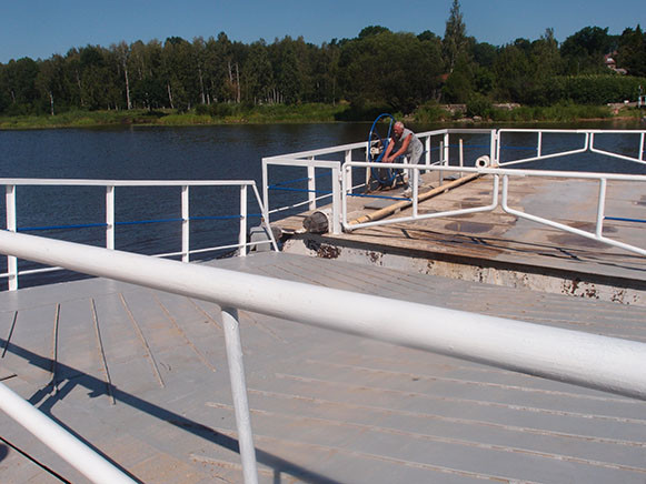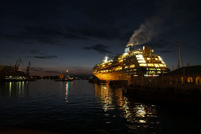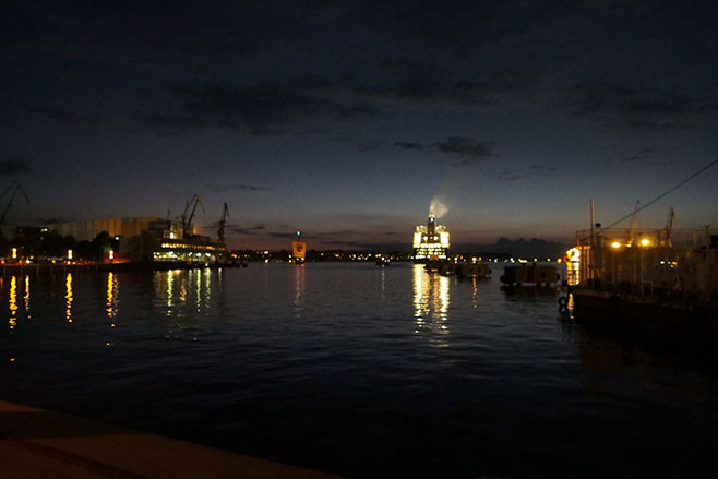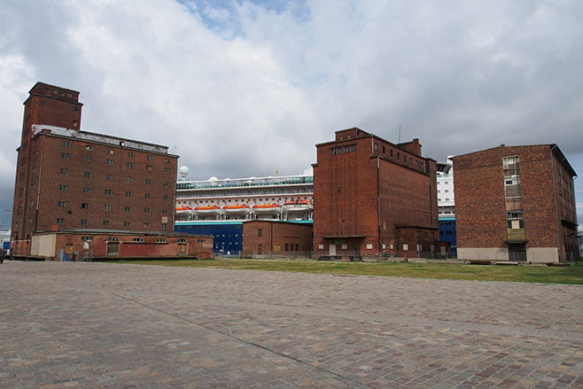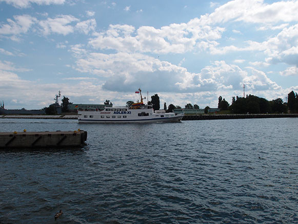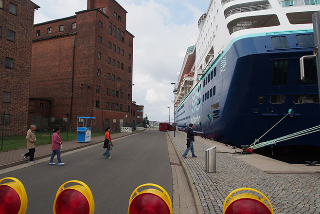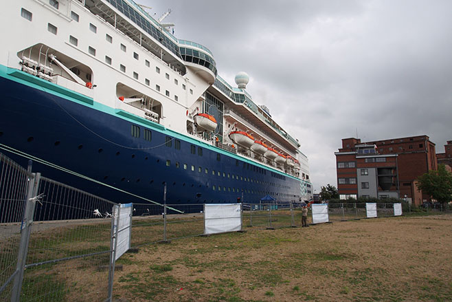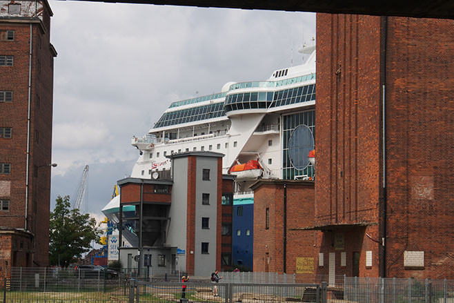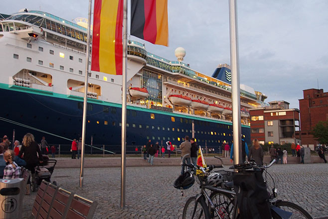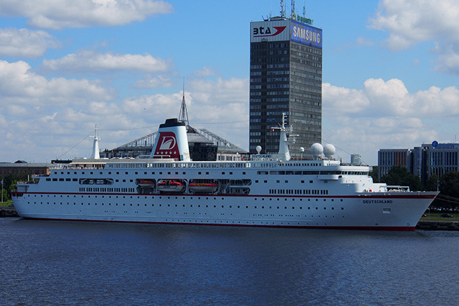 Am Ufer der Daugava hatten wir schon gestern auf der Heimfahrt zum CP das Kreuzfahrtschiff MS Deutschland (das 'Traumschiff') am Kai liegen sehen - jetzt lag es immer noch da, schien aber bald ablegen zu wollen.