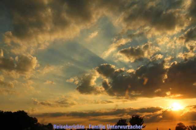 Sobald wir im Womo sitzen, beginnt der Urlaub für mich. Das Wetter ist wunderbar, der Verkehr ist erträglich und so tuckern wir gemütlich durch Deutschland. Schon jetzt bewundern wir eine herrliche Abendstimmung. Ob das im Norden auch so schön wird?