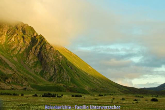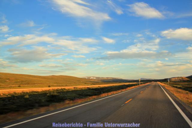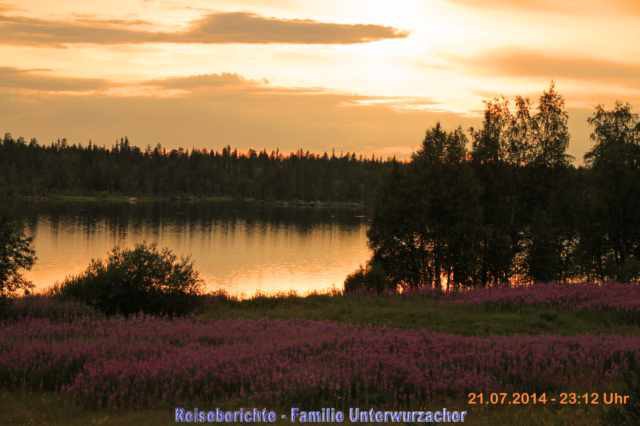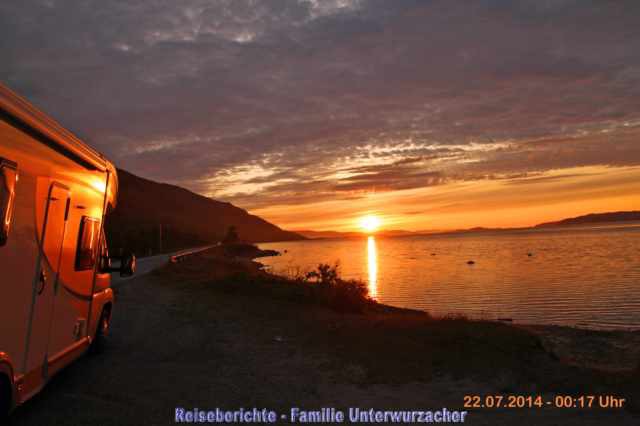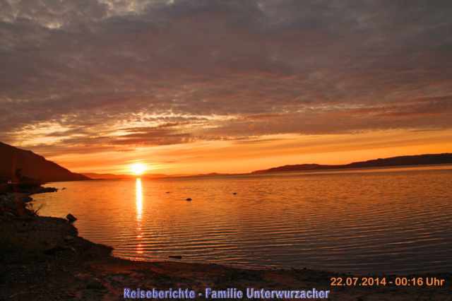 Dank der nördlichen Lage wird es nicht dunkel. Um 23:00 Uhr ist es fast noch taghell und ich werde nicht und nicht müde. Um Mitternacht wird die Stimmung romantisch dunkelrot - so wie auf Korsika die legendären Sonnenuntergänge. Nur mit dem Unterschied, dass die Sonne eben NICHT untergeht und sich daraus wunderschöne, einmalige Anblicke ergeben, die noch dazu relativ lange zu sehen sind. Dazu kommt eine Landschaft, wie ich sie vorher noch nie gesehen habe.