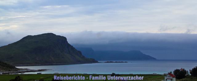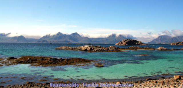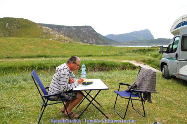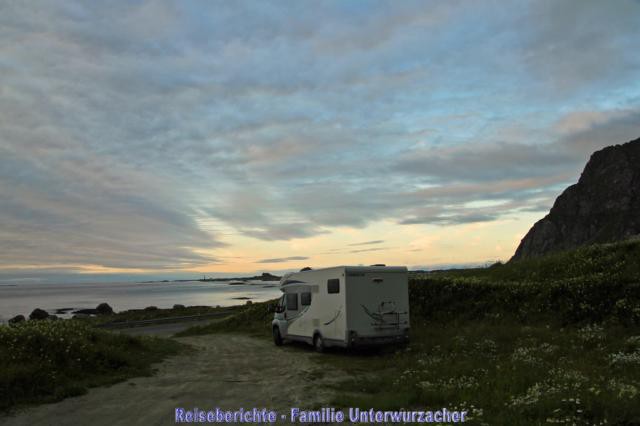 Auf dem großen Besucherparkplatz übernachten wollen wir nicht, also folgen wir den Rat unserer Reiseführer und fahren nach Haukland. Hier empfangen uns so ca. 15 Wohnmobile, einige Zelte und viele PKW’s und ein sensationeller, weißer Sandstrand. Hier schlagen wir für heute unser Nachtlager auf. Wir haben trotz relativ weniger Reisekilometer sehr, sehr viel gesehen und werden sicher heute vom Erlebten träumen …