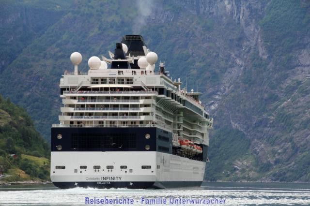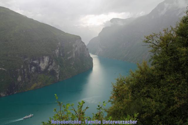 Den Nachmittag verbringen wir in Geiranger: Hier kann man Souvenierläden besuchen und wirklich vortrefflich die anderen Touristen, die von dem Kreuzfahrtschiff strömen, beobachten. Währendessen stöbert meine, wieder zu Atem gekommene Gattin, ebenfalls in den vielen Souvenirläden nach Andenken und Sonstigem. Wir bestaunen das Kreuzfahrtschiff, wie es aus dem engen Fjord ausläuft. Wie auf einen Schlag ist Geiranger zwar nicht Menschenleer, aber doch irgendwie momentan vereinsamt. Die Läden schließen und auch wir verabschieden uns.