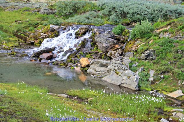 Einen der größten Flusswasserfälle finden wir am Malselvfoss und wandern ein bisschen. Wirklich beeindruckend. Weniger beeindruckend ist das touristisch angepriesene Lachsstudio - es entpuppt sich als Aquarium mit trüben Glas, in dem sich ein paar Lachse langweilen. Besser gefällt uns das leckere Eis und der norwegische Kuchen, den wir uns in der Jausenstation munden lassen.