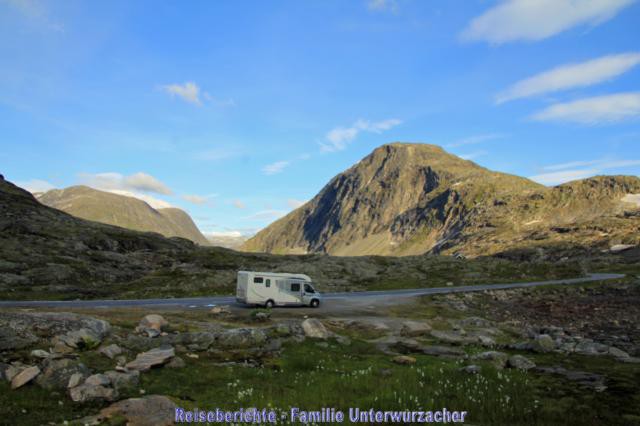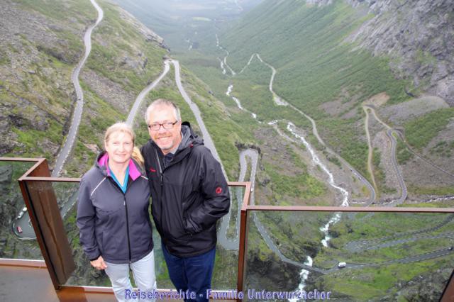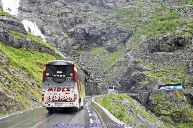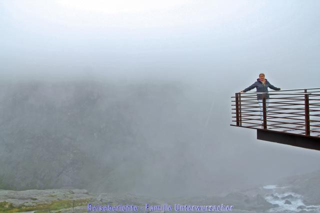 Sonja hat gesagt, das Rauschen des Wasserfalls in der Nacht beruhigt und dafür haben wir in der Früh einen wunderschönen Anblick auf die Wassermassen, wenn sie in der Morgensonne in die Tiefe stürzen. Mit dem Rauschen in der Nacht hat sie recht gehabt, mit der Morgensonne überhaupt nicht! Der Regen prasselt auf unser Womodach und über dem Wasserfall liegt dichter Nebel. Sollen wir bei diesen Bedingungen die Trollstige rauffahren? Ja, unbedingt. In den letzten Tagen hatten wir an einem Tag oft Regen, bewölkt und Sonnenschein sowie Temperaturen von +11° bis +24° C erlebt. Also bis auf Schnee so alle möglichen Wetter-Kapriolen, die es gibt.