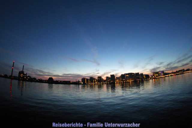 Heute am Morgen war die Aussicht nicht mehr ganz so bezaubernd wie gestern in der Nacht. Die beleuchteten Häuser am anderen Ufer und die Skyline von Kopenhagen direkt vor unserem Wohnmobil war schon der Wahnsinn. Heute in der Früh ohne Beleuchtung schaute alles ein bisschen nüchterner aus – trotzdem war es aber noch immer ein wunderbarer Stellplatz.