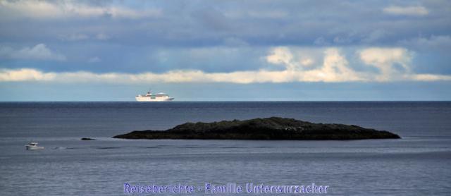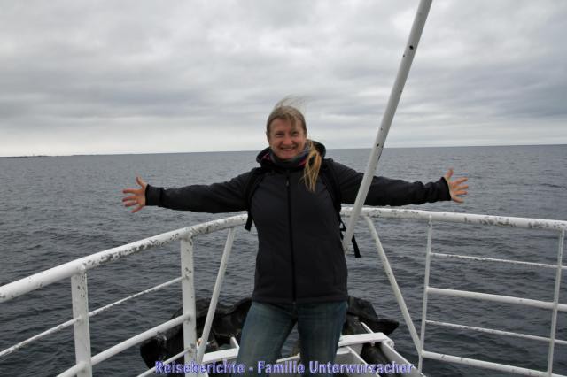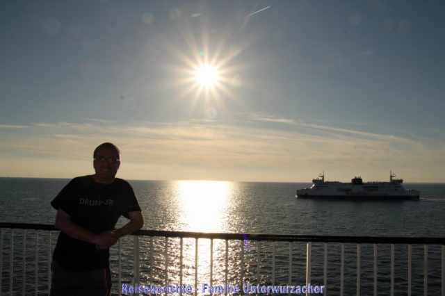 In der Zwischenzeit ist es 15:00 Uhr, die Fähre hat abgelegt, wir sind mit auf’s Schiff gekommen (einige andere Wohnmobile leider nicht) und das Wetter ist wieder himmlisch und heiß geworden. Jens, der Fischergeselle hat uns erzählt, dass man sich nicht zurück erinnern kann, dass es so lange, so warm war in dieser Gegend. Tja, das alte Sprichwort: „Wenn Engel reisen ….“ bewahrheitet sich wieder einmal. Die See ist absolut ruhig, Sonja bastelt und ich schreibe und fotografiere. So wird die Zeit der Fährfahrt auch vorüber gehen.