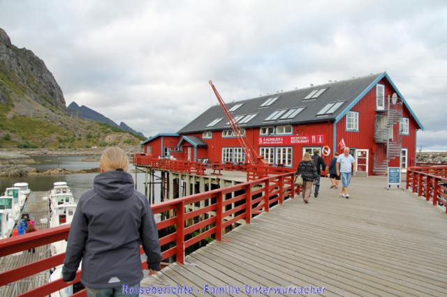 Wir schlendern durch das Fischerdorf A und treffen Jens. Jens ist Fischerreigehilfe und plaudert eine Stunde lang mit uns. Sein Chef Fred und er betreuen die meist deutschen und österreichischen Fischtouristen, die nach A kommen, um die Jagd auf Heilput, Steinbeißer, Seelachs, Makrelen und auch Dorsch zu wagen. Jens erzählt uns lange und viel über alles Wissenswerte. Nach einer guten Stunde plagt uns nach so viel neuem Wissen der Hunger. Im bekannten Fischrestaurant am Hafen kostet ein Steak NOK 295,-- und ein Bierchen NOK 110,--. Für gut € 50,-- kann man hier also gut und teuer essen und trinken.