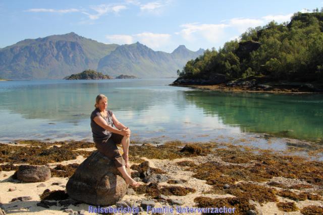 Nach dem Studium von vier verschiedenen Reiseführern und –Berichten suchen wir unsere Highlights aus und genießen das Leben, die Lofoten und den Urlaub. In „Kalle“ gehen wir bei + 24° C Außentemperatur und ca. + 19° C Wassertemperatur ins seichte Fjordwasser.