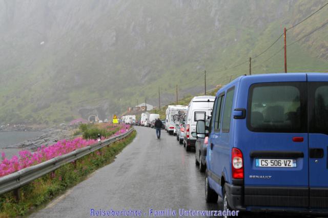 Das Wetter ist heute – wie gesagt: nicht so schön – und die Landschaft zeigt sich in einem, immer noch sehr interessanten, düsteren Licht. Dieses können wir lange betrachten, als sich kurz vor Reine auf der E10 vor einem Tunnel ein Stau bildet. Geduldig warten wir, denn die Chancen für eine Alternative sind relativ schlecht. Ein paar Ungeduldige wenden auf der schmalen Straße, aber wir wollen zum Ende der Lofoten und da führt laut unseren Karten kein anderer Weg hin. Der Stau wird immer länger und eine nette Dame erklärt uns, das bei Bauarbeiten eine Gefahr aufgetreten ist. Das Ganze kann jetzt eine Stunde oder vielleicht auch ein paar Stunden dauern. Naja, lustig ist es nicht, aber wir haben ja in unserem Womo alles, was man benötigt und so gibt es eben die tägliche Kaffeepause mitten auf der Straße nach Reine. Erst nach einer guten Stunde kommt Bewegung in die Sache und die ersten Fahrzeuge von der anderen Seite kommen uns entgegen. Nach einer weiteren halben Stunde können auch wir fahren und passieren eine himmellange Baustelle neben dem Ufer.