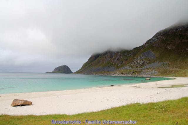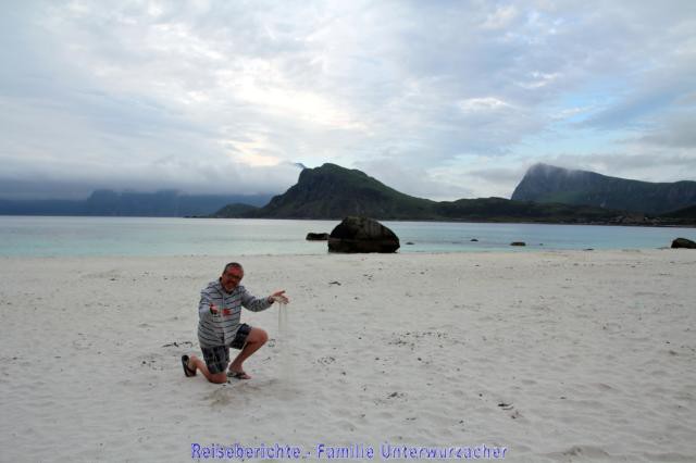 An diesem Traumstrand in Haukland (er wurde 2005 zum schönsten Strand der Welt (?) gewählt) ist das Wetter nicht ganz so traumhaft. In der Nacht hat es geregnet, aber das macht nichts, dafür schlafen wir lange. Nach dem Frühstück folgt ein ausgiebiger Spaziergang am blütenweißen Sandstrand.