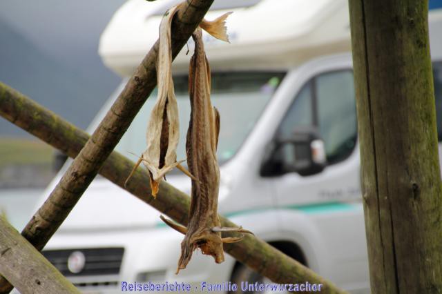 Wir besuchen Reine und anschließend geht es weiter in den Ort mit dem kürzesten Namen: A. Die geplante Wandertour müssen wir leider wegen dem schlechten, nassen Wetter ausfallen lassen. Auf einem großen Parkplatz am Ende der Welt – Nein, am Ende bzw. Anfang der Lofoten (je nachdem aus welcher Sicht man es sieht) in A stellen wir unser Womo in Nachbarschaft vieler anderer Womos ab.