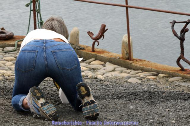 Ein nettes Örtchen wo wir uns ein Eis genehmigen. Anaschließend ist Sonja wie vom Erdboden verschwunden. Sie ist in einen der Souvenierläden gegangen, während ich dem Hafen zusteuerte. Ich fand sie nicht mehr und sie mich nicht mehr … quasi Trennungsschmerz pur! Erst als ich beim Womo angelangt war und mir überlegte, eine Vermisstenanzeige aufzugeben, tauchte auch Sonja wieder auf. Leicht verärgert, dass ich sie alleine gelassen hatte, aber die Wiedersehensfreude überwiegte bald wieder und so fuhren wir geeint die Strecke wieder retour. Und es war durch die richtige Sonneneinstrahlung noch um einiges beeindruckender! Steile Berge gehen in sanfte, grüne Streifen über, die von bunten Blumen aufgefrischt werden. Das Ganze versinkt neben der Straße in den turkisblauen Wasser der Fjorde, aus denen runde Steine und grüne Inseln heraus ragen und ein fast unwirklich, schönes Bild zeichnen. Wir sind begeistert und kommen mit dem Fotografieren kaum zusammen.