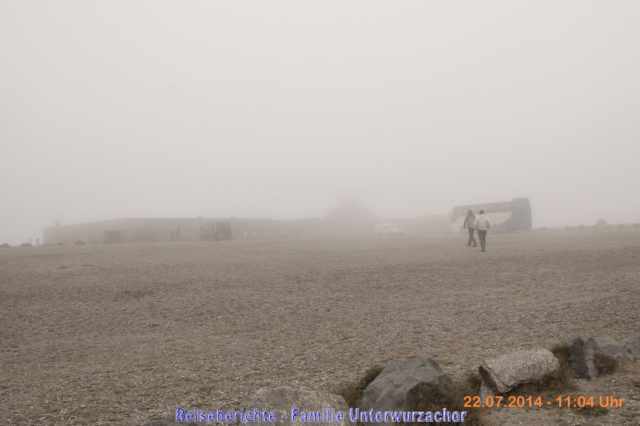 Auf der Passhöhe ist eine ansprechende Aussichtsplattform angelegt und wir freuen uns sehr darüber, dass für ein paar Minuten der dichte Nebel sich lichtet und sogar die Sonne hervorlugt.