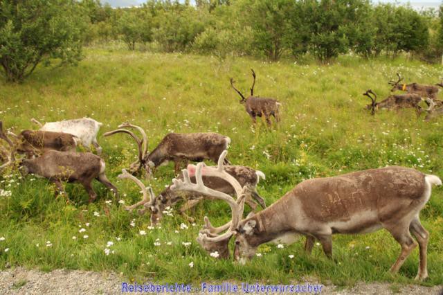 "5. Juni 2013 Alta - Nordkapp Wir haben den Wetterbericht richtig interpretiert und machen uns bei strahlendem Wetter auf zu unserer letzten Etappe ans Nordkapp. Dass diese letzten Kilometer langweilig sein sollen und das Nordkapp die Reise nicht wert, da es sowieso immer Schlechtwetter gibt, können wir überhaupt nicht bestätigen. Für mich ist diese letzte Etappe eine der sehenswertesten und interessantesten überhaupt. Was aber zugegebenermassen sicher auch am Wetter liegt. Die Strecke ist sehr abwechslungsreich, wenn man auch neben die Strassen schaut. Wir sehen wunderschöne Landschaften, flach und hügelig, Seen und Meer, die Natur, welche zu neuem Leben erwacht und massenhaft Rentiere. Kleinste Blumen und Moose geben dem Frühling seine Farben. Überhaupt ist Norwegen ein einziges Farbenspiel."
