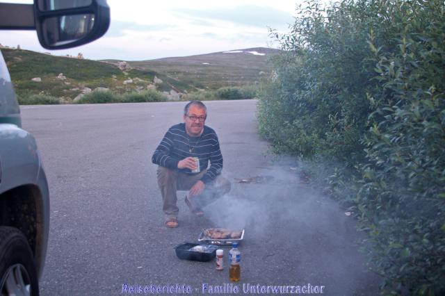 Anschließend geht es auf der E6 weiter gegen Süden. Genau am Polarkreis schlagen wir am INFO-Zentrum unser Nachtlager auf und grillen uns bei herrlicher Abendstimmung ein paar norwegische Koteletts.