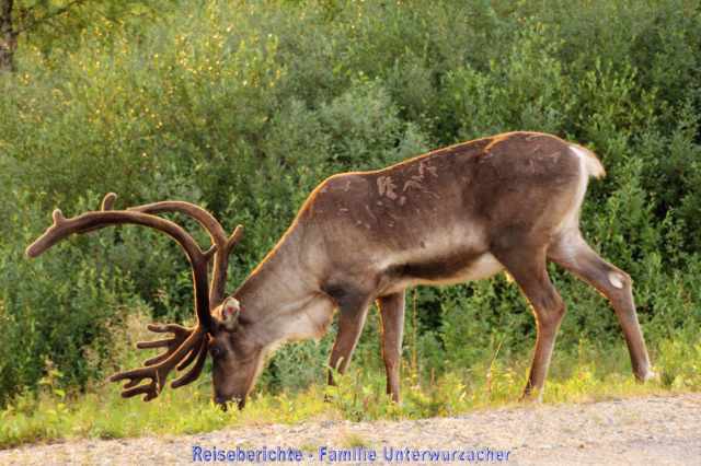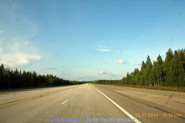 Wir fahren und fahren und die Zeit vergeht wie im Fluge. Das Wetter ist optimal und die Strecke zwar meistens einspurig, aber in gutem Zustand. Fast kein Verkehr, höchstens jede halbe Stunde kommt uns vielleicht ein Auto entgegen. Viel Wald, sehr viel Wald, einige Rentiere und wenige Häuser säumen die langen, geraden, hügeligen Straßen.