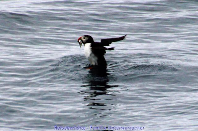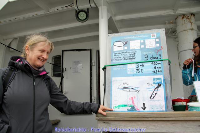 Der südländisch wirkende Kapitän mit dunkler Sonnenbrille (irgendwie erinnert er mich an den Kapitän der Costa Concordia ...) sitzt auf dem freien Oberdeck und sucht mit Unterwassermikrophonen nach dem "Klicken" der Wale. Begleitet wird er von seinem pensionierten Vater, ebenfalls ein ehemaliger Kapitän. Beiden merkt man die Routine an und so können wir uns sicher fühlen an Bord. Ein junge Wissenschaftlerin vom Walinstitut begleitet die Tour und dokumentiert alles. Unter Deck in der Steuerkanzel befindet sch der Co-Kapitän, er schläft die ganze Zeit und hilft nur später beim Anlegen mit, sowie eine Navigatorin, die sich die Zeit mit Kaffee und Zigaretten vertreibt. Wir sind hingegen hellwach und halten so wie von unseren Guides empfohlen, nach dem "Blas" der Wale Ausschau. Und wirklich - Sonja hat Glück und kann einen der Wale als Erste erspähen. Daraufhin erfolgt ein "Maschinengewehrgeratter" der Fotoapparate, dass man meinen könnte, man befände sich auf dem roten Teppich bei den Filmfestspielen in Cannes. Hier tummeln sich aber keine Filmsternchen sondern neben den Walen auch noch zahlreiche Papageientaucher und andere Wasservögel, sowie eine "Armada" an Schlauchbooten der Walsafari-Mitbewerber.