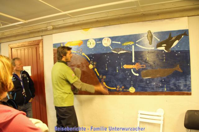 Für 890,-- NOK (gut € 100,--) pro Person werden wir im Walmuseum sehr kompetent auf Deutsch über die Wale aufgeklärt. Vorher wurden wir noch sprachlich in Gruppen aufgeteilt, wobei sich ein bayrischer Landsmann nicht ganz sicher ist, ob er nun der deutschen Sprachgemeinschaft angehört oder nicht.