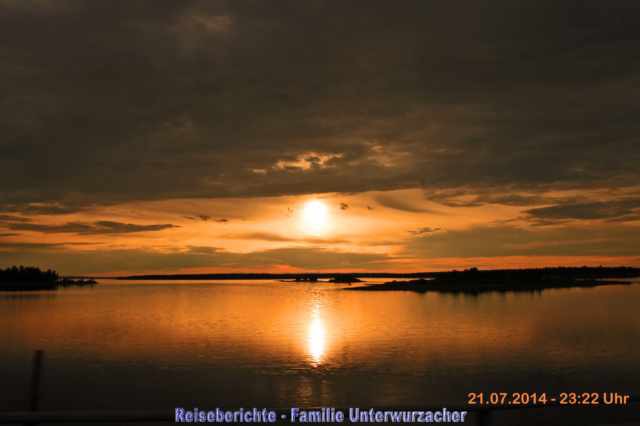 „Rüber“ wollte ich unbedingt über die insgesamt 16 Kilometer lange Öresundverbindung (Tunnel und längste Schrägseilbrücke der Welt) zwischen Kopenhagen (Dänemark) und Malmö (Schweden). Zwar mit € 97,-- für unser Womo nicht gerade günstig aber doch ein Erlebnis. In Schweden geht es dann über gut ausgebaute Autobahnen weiter. Die Gegend ist leicht hügelig. Man merkt schön langsam, dass wir immer nördlicher kommen – die Sonne geht ca. um 21:30 Uhr unter. Wir gleiten im rötlichen Abendlicht an Seen vorbei, ich lege den USB-Stick mit den Musikvideos ein und lasse den Zufall entscheiden, welche Musik mich begleitet. Als die einfühlsame Stimme von Xavier Naidoo und anschließend „What a wonderful world“ erklingt, ist die Stimmung fast nicht mehr zu toppen. Als das Video von „Convoy“ abläuft, ist es einfach nur mehr geil und ich muss aufpassen, dass ich mich auf meine Straße konzentriere. Der einsame Ritter mit dem Wohnmobil auf der langen Straße durch Schweden fährt in den purpurroten Sonnenuntergang … Wohnmobilfahrerherz, was willst du mehr! Sinead O‘ Connor singt dann noch: „Nothing compares to you – Nichts ist vergleichbar mit dir …“ und ich möchte ihr in meiner absoluten Hochstimmung fast glauben. Gott sei Dank ist noch Sonja an Bord, die mich dankenswerter Weise wieder auf den Boden der Realität bringt und so gelangen wir sicher bis ca. 180 km vor Stockholm …