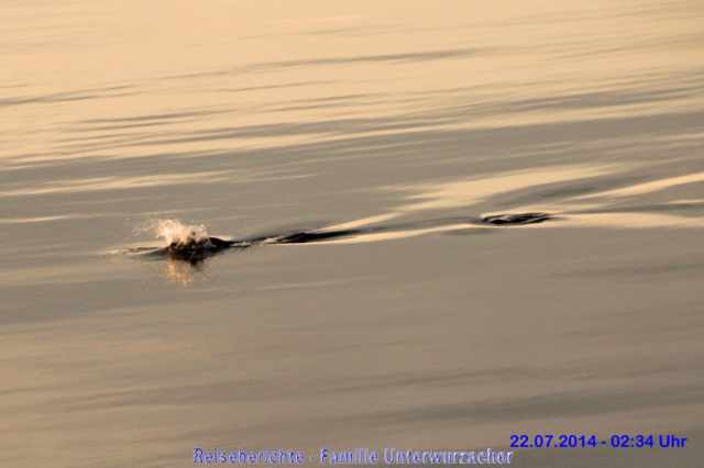 Nur langsam vergeht die Sonnenröte und es wird heller. Am Meeresufer begleiten uns eine Zeit lang Schweinswale - Kitsch pur ...