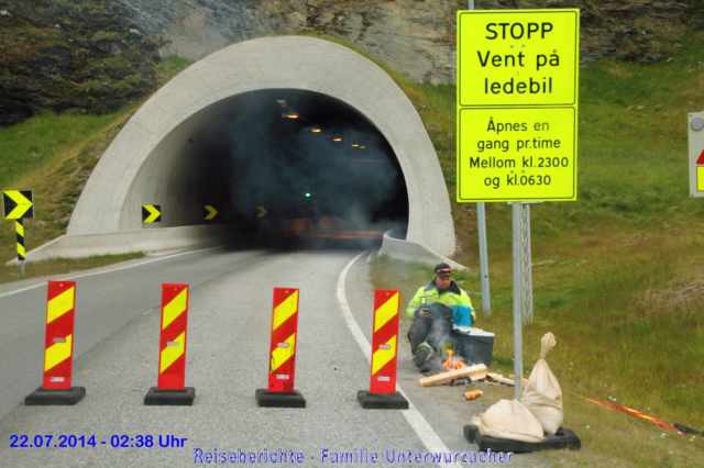 Vor dem Nordkaptunnel werden wir dann noch um halb vier Uhr in der Früh wegen Revisionsarbeiten aufgehalten - Wartezeit: Ca. eine Stunde - auch schon egal .... Ich mache mir einen guten, warmen Kaffee (Sonja schlummert friedlich vor sich hin ...). Zusammen mit dem Wachposten warten wir auf die Freigabe des Tunnels. Er erzählt mir, wie "shit" dieser Job sei und ich erzähle ihm, wie schön es auf der Welt ist ...