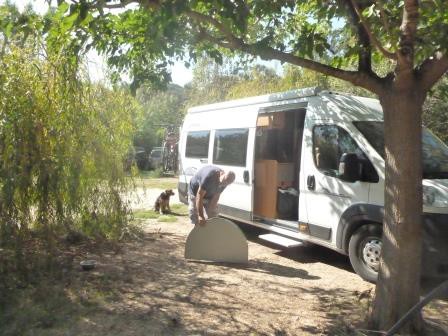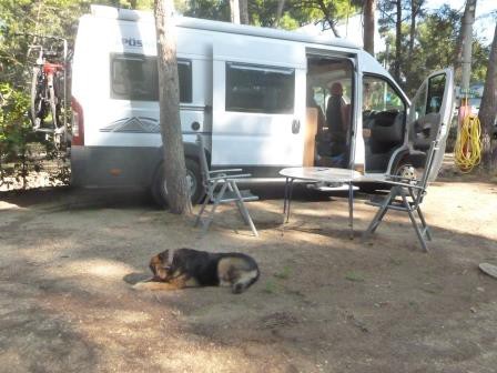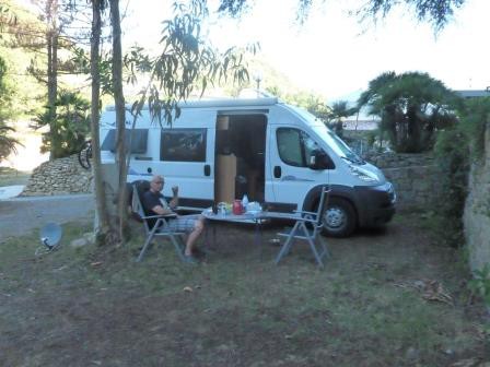 Dann kam ein weiteres Fahrzeug den Berg runtergefahren und stellte sich hinter uns. Mittlerweile war es dann kurz vor halb drei. Die Dame stieg aus und es stellte sich heraus, dass sie wohl zum Campingplatz gehörte. Sie ließ uns durch das „Restauranttor“ rein und bat uns, dass wir uns im Büro dann anzumelden. Ok. Wir fuhren also auf den Platz. Nach einem kurzen Gespräch mit einem Deutschen Urlauber (endlich versteht uns jemand) suchten wir uns einen der wenigen freien Plätze aus und bauten uns auf. Unser Hund weigerte sich auszusteigen. Der ganze Platz war ziemlich dreckig und am Abend stellten dann auch wir (Hunde haben ja bekannter weise eine gute Nase) einen abartigen Abwassergeruch fest. Das ging mal gar nicht.