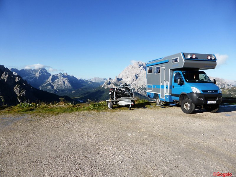 Jetzt geht es in die Dolomiten. Über den Plöckenpass sind wir nach Tolmezzo, Campolongo, Auronzo die Cadore und Misurinasee hinauf auf den Parkplatz bei der Auronzo-Hütte auf 2300m Höhe gefahren. Den Platz kann man als Ausgangspunkt für einige Wanderungen benutzen und auch über Nacht stehen bleiben, aber die mautpflichtige Straße kostet heftig Geld: 36€. Von dort oben, am Wandfuß der Drei Zinnen, hat man eine wunderbare Aussicht auf die umliegenden Berge und die Nacht war absolut ruhig. Am Morgen gab es ein kostenloses Frühstückspanorama bei gutem Wetter. Ent- und Versorgen konnten wir das Gogolobil am Stellplatz beim Misurinasee.