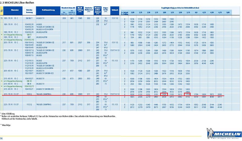 ... wir sind sehr zu frieden. Vielleicht läuft die Kiste auch zu gut, fast schon wie ein Pkw. Nur habe ich beim Pkw kein Geschirr in Schränken an Bord. MfG Steffen Hallo Jürgen! Du bist tatsächlich in der falschen Spalte für Einzelradaufhängung. Sorry, hab ich übersehen. Geh etwas höher dort findest du die von mir angegebenen Werte. Die Seiten kannst du auch nicht nebeneianderlegen. Das ergibt keinen Sinn. LG. Wolfgang Ich denke, dass gerade das nebeneinaderlegen der Seiten Sinn macht. Auf Seite 94 (bzw. 70 2014er) sind die technischen daten und auf 95 (71) die Luftdrucktabelle dazu. Man sieht auch das die Zeileneinteilung dazu passt, auch bei den Seiten davor (14 Zoll) und danach (16 Zoll aufwärts).Das E steht für Einzelradanordnung im Gegensatz zu Zw für Zwillingsbereifung. Und das bei den CP Reifen in Vorederachse und Hinterachse unterschieden wird, liegt denke ich an den relativ großen Hecküberhängen bei vielen WoMos und die dadurch entstehend starke Querbelastung in Kurven. Ich würde gerne daran glauben das du mit den niedrigeren Werten Recht hast (ergäbe noch mehr Fahrkomfort), aber meine Auslegeung erscheint mir logischer. Vielleicht kann ja ein Fachmann Klarheit reinbringen. Jürgen Hat jemand die Tabelle?