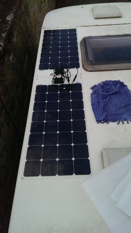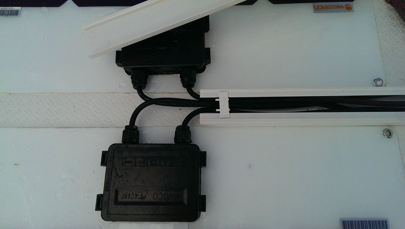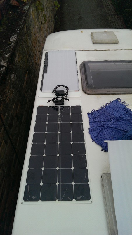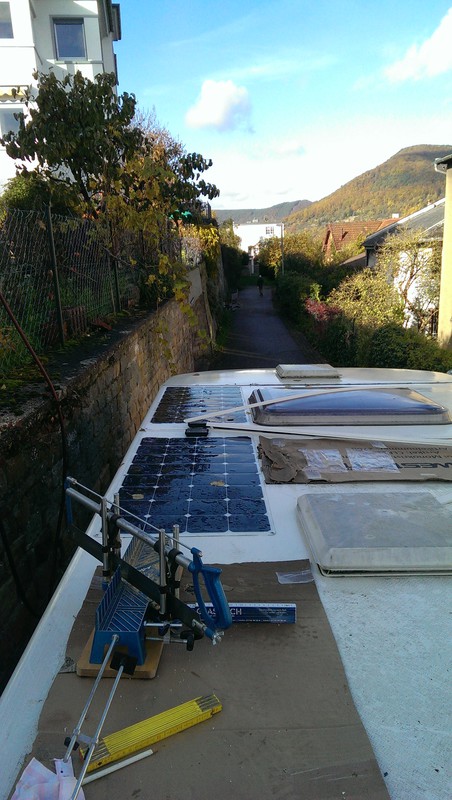 Die Paneele scheinen mir die billigen China-Dinger zu sein mit nachträglich überklebtem Anschlussmodul und konfektionierten Leitungen. Sie haben rückseitig eine weisse Folie und kein durchgehendes Metallblech als Trägermaterial. Wenn ich das gewusst hätte, hätte ich auf das teure Sikakleb-Zeugs verzichtet und hätte einfach mit Baumarkt-Silikon geklebt.
