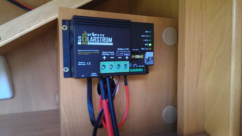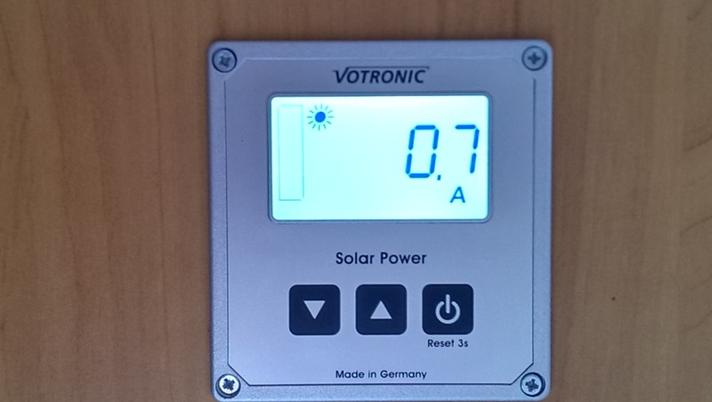 (für ca.100€) Wenn die Sonne scheint, ist die Aufbaubatterie schnell voll (14.8V) und der Regler regelt runter