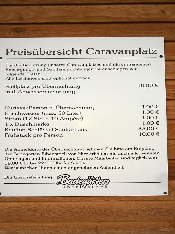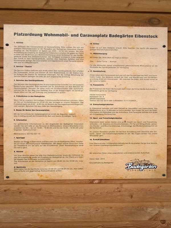 --> Link ![]() ![]() ![]() Der Stellplatz gehört zu den Badegaerten Eibenstock --> Link. Für Saunafans ein absolutes Must have :!: Man steht auf komprimiertem Schotter mit Rasen. Teilweise sind die Stellplätze durch kleine Sträucher abgetrennt. Es sind 16 Plätze vorhanden und man sollte um einen Platz zu bekommen ggf. reservieren. Hat einen weiteren Vorteil, dass die Anmeldung deutlich verkürzt wird :mrgreen: Die Preise auf dem Stellplatz sind weiter so wie beschrieben. Von den 10€ wurden bei uns 7€ für den Eintritt angerechnet. Das Waschhaus bieten top saubere und beheizte Duschen und Toiletten. Zudem einen Waschmaschine und Trockner. Auch kann man im Haus abwaschen. Im Ortszentrum gibt es ein Penny und zahlreiche Restaurants. ![]() ![]() ![]() ![]() ![]() ![]() Beim Stellplatz ist noch alles wie beschrieben. Äusserst empfehlenswert sind die 24 Stunden Sauna Events der Badegärten. Was hier für Saunafans geboten wird sucht seines gleichen. Hier wird Sauna zelebriert und geliebt.. :mrgreen: |