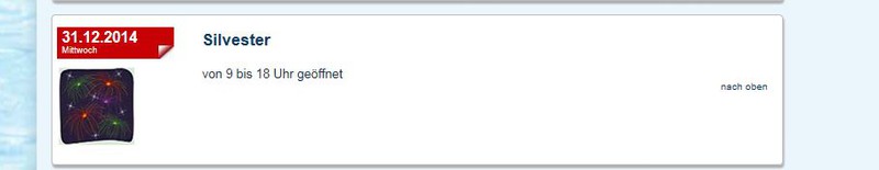 Die Kristallthermen haben bis 18 Uhr geöffnet. Und ich kann mir kaum vorstellen, dass danach Altenau zur Sylvester Hochburg mutiert.. :wink: Das gleiche gilt für Seeltze ät Susanne ja das wäre schon OK. Solche Events meinte ich. Nur lange offen hat Silvester natürlich keiner. Die Therme kenne ich zwar nicht aber die scheint ganz brauchbar zu sein. Allerdings wieder 300 Km weit weg :cry: Ich denke aber das kann man vergessen. Im näheren Umkreis ist ncihts zu machen. Zumal ich die meisten Thermen die näher dran sind auch kenne und im Internet abgeklappert habe.