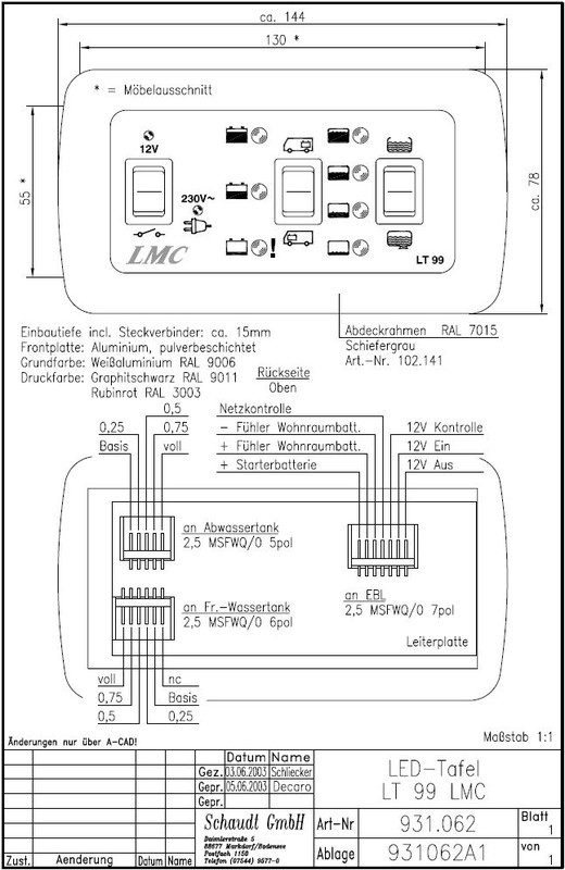 hallo, Foristen , ich habe einen T 348 , wie oben , habe aber u.a. , weil das Bord Controll Panel nur mit LED funktioniert schon mehrmals meine Batterie ganz leer genuckelt . Im Frühjahr möchte ich zwei neue 80 Ah einbauen und damit mir das nicht wieder geschieht , jedenfalls ich bevor es geschieht , weiss welche Kapazität die Batterien noch haben , möchte ich ein anderes genaueres Bord Controll einbauen lassen . Hat jemand eine Idee , ob das geht , welches Instrument gut wäre, woher man sowas beziehen könnte und wie hoch etwa die Kosten sind ? Für eure Antworten wäre ich dankbar. TI statt Kapuze . Giovanni. Hallo, Dein Board Control Panel (ich nehme an EBL 99K) hat mit Sicherheit nicht Deine Batterie geleert. LEDs benötigen nicht viel Strom. Zumal sind die LEDs nur kurz im Betrieb. Der erhöhte Strombedarf hat eine andere Ursache, die Du ergründen müsstest. Ich rüste mir ein Voltmeter und ein Amperemeter (Voltmeter 200mA über den EBL Shunt) nach und kann so die Batteriespannungen anzeigen lassen. (Eigenbau - Panel), die Anschlüsse dafür greife ich am EBL / EBL Panel ab. Amperemeter (200mV über den EBL Shunt) --> Link Voltmeter --> Link In der Bauform gibt es auch ein Thermometer mit externem Fühler (z.B. für Außentemperatur) Das Ganze kommt auf eine ALU-Platte neben dem Original-Panel und wird auch Platz für einige Zusatzschalter bereitstellen (Lichtleisten, sonstiges). Wenn Dein WoMo steht, solltest Du die 12V Bordversorgung am Panel ausschalten, dann wird fast alles von der die BB getrennt (Kühlschrank-LCD, Heizung, Steckdosen, Anzeigen LED's...) und Du solltest keine schleichende Entladung mehr haben. und Deine Batterie kann