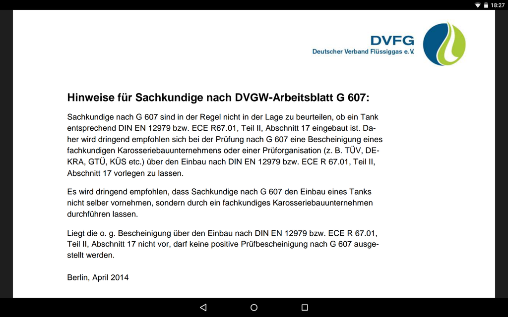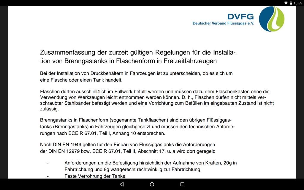 Die aktuellen Vorschriften sind von April 2014 und empfehlen dringend sich eine Bescheinigung über den fachgerechten Einbau ausstellen zu lassen, da es ansonsten bei der Gasprüfung zu Problemen kommen kann. Ein Eintrag im Gasbuch alleine ist nicht mehr ausreichend, da der Prüfer in der Regel den fachgerechten Einbau nicht überprüfen kann. ![]() Hier nochmal die Regelung, daß festeingebaute Brenngastanks in Flaschenform (sogenannte Tankflaschen) den übrigen Flüssiggastanks (Brenngastanks) in Fahrzeugen gleichgesetzt sind: ![]() Mein persönlicher Tipp zu dieser undurchsichtigen Regelung. Wenn der Einbau durch eine Fachfirma erfolgte, fordert diese Bescheinigung ein, eventuell auch nachträglich. Dann ist man auf der sicheren Seite und braucht später keine Probleme befürchten. Michael die " werkstatt meines vertrauens " vertraute mir soeben an, das ich - vorerst - auf den einbau dieser gastankflaschen ( geplant sind zwei, für euro 600,-- stück ) verzichten sollte, da es ( noch ) nicht zweifelsfrei feststeht, ob die angebotenen - seriösen - firmen auch gewährleisten/garantieren können, das der tüv diesen flascheneinbau auch ordnungsgemäss abnimt... :juggle: es ist zwar eine zusätzliche stahl-einbau-konstruktion notwendig, die die flaschen nicht nur mit den riemen festhält.. die oben erwähnten " 20 mg " spielen da auch eine rolle.. aber was nutzen mir eure hochgeschätzten meinungen, und die 20 mg-grenze, und der eintrag ins " gelbe buch ", wenn der tüv das ganze nicht abnimmt?- denn das ist doch das einzig entscheidende: darf ich mit solch einer konstruktion umherfahren, oder nicht?.. :!: 20 mg ? Milligramm? Es handelt sich um 20 g (G ravitation) (1 g = Erdbeschleunigung/Massenanziehung = die Gewichtskraft) 20 g also das 20-fache des Gewichts. Ja, würde auch erstmal abwarten, ob sich die Brüder aus Habgier u. Neid noch weiter austoben u. ernste Restriktionen durchsetzen. Tankflasche auf 20/8 g fixieren gegenüber Tauschflasche mit Riemen fixieren = technisch der letzte Witz. Gr. Richi 20 mg ? Milligramm? Es handelt sich um 20 g (G ravitation) (1 g = Erdbeschleunigung/Massenanziehung = die Gewichtskraft) 20 g also das 20-fache des Gewichts. Ja, würde auch erstmal abwarten, ob sich die Brüder aus Habgier u. Neid noch weiter austoben u. ernste Restriktionen durchsetzen. Tankflasche auf 20/8 g fixieren gegenüber Tauschflasche mit Riemen fixieren = technisch der letzte Witz. Alternative: richtiger Gastank. Gr. Richi . . . Vermutlich kommen zu dieser Preisangabe ja noch weitere Kosten (Außenbetankung, Fernanzeige, Filter . . .) dazu. Wenn ich dann schaue, was mein 80-l-Gastank vor der Hinterachse bei Carsten Stäbler (auch komplette Wynen-Technik) mit allem Drum und Dran gekostet hat, könnt ihr von diesem Preis nicht mehr weit weg sein. Lohnen sich dann Flaschen überhaupt noch? Mein Gaskasten ist leer. Zur Not könnten aber auch Flaschen hinein, da beim Umbau ein Dreiwegeventil integriert wurde. Vielleicht noch mal darüber nachdenken? TÜV und Eintragung kein Problem. Also wenn schon Betankung, dann würde ich auch in Richtung festen Gastank mit Fernanzeige und Fern-Abschaltventil gehen - so groß sind die preislichen Unterschiede im Vergleich zur nutzbaren Gasmenge nicht und man gewinnt Stauraum. Bei einem etwas größeren Gastank hat man auch noch Gewichtsvorteile Tara vs. Netto Gasgewicht. 2 11kg Tankflaschen entsprechen in etwa einem 60l Tank. Ja, wenn da der Fiskus u. die damit verbundene Juristerei nicht wäre! Denn streng genommen soll das steuerbegünstigte LPG nur motorischen Zwecken dienen. Italienische Tankstellenbetreiber fürchten ihre "Fianzpolizei", deshalb lehnen einige das Betanken v. Womo-Tanks ab. Nett: An Tankst. in der Vulkaneifel betankte eine junge nette , laut Aufkleber grüne, Dame, ihr Gasauto u. fand es gut, daß ich den Ducato auch mit Gas umweltschonend betankte. Ich brachte, sie zu belügen, aber nicht über's Herz u. klärte sie auf, sie war sichtlich enttäuscht. Gibt auch Gas-Ducatos, aber in Womos?? Gr. Richi